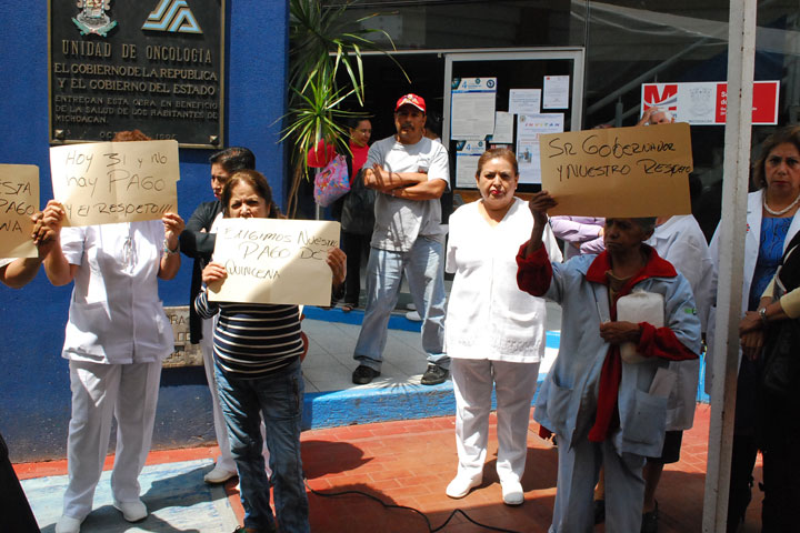 NOTICIAS 31/08/2012Otra manifestación, pero de trabajadores de la saludTrabajadores del Hospital Civil se manifestaron esta mañana durante una ceremonia realizada en el Centro Estatal de Atención Oncológica (CEAO), ya que afirman que a más de 15 mil trabajadores de salud de todo el estado no se les pagó esta quincena.