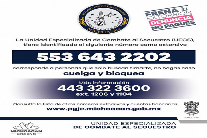 En el marco de las acciones llevadas a cabo para inhibir conductas ilÃcitas, la ProcuradurÃa General de Justicia del Estado de Michoacán invita a los ciudadanos a denunciar el delito de Extorsión.