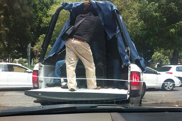 Y es que, la fotografía captada desde un vehículo, en la Avenida Solidaridad y Boulevard Sansón Flores de Morelia, evidencia en la caja de la camioneta de pie, a un sujeto vestido con playera negra y pantalón café así como botas de color café y, al fondo, dos sujetos... Ver más...