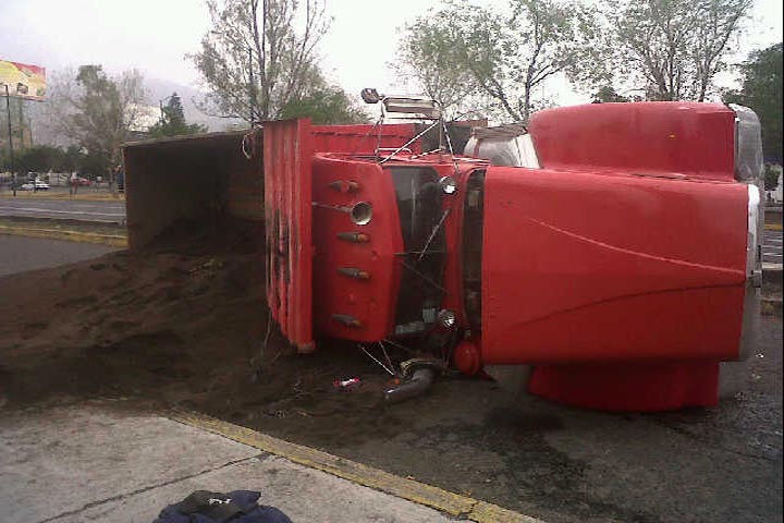 La mañana de este lunes un camión tipo volteo cargado con aproximadamente 20 toneladas de arena, tras quedarse sin frenos, sobre el Periférico República, a la altura de la colonia Lago II.