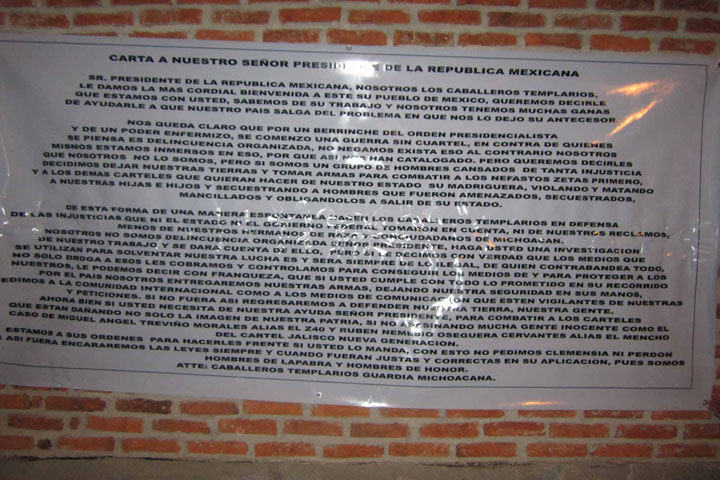 Dichos rótulos rezaban textualmente: "Carta a nuestro señor presidente de la republica mexicana. Sr. Presidente de la republica mexicana, nosotros Los Caballeros Templarios, le damos la más ... Ver más...