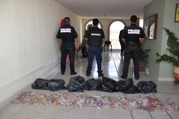El Ayuntamiento de Morelia desplegó su equipo de fuerza para llevar a cabo el aseguramiento de productos elaborados con pólvora; más de 10 mil piezas de cuetes, palomitas, cebollitas, cazuelitas, chifladores y cerillos, fueron retiradas de la vía pública y de puestos instalados en las afueras del Mercado Independencia.