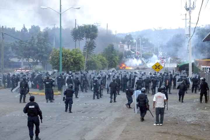 La tarde de este lunes, los manifestantes que mantenían bloqueada la salida a la autopista Siglo XXI, se enfrentaron durante más de dos horas a más de un centenar de policías federales, mientras un helicóptero sobrevolaba el lugar a baja altura; le prendieron fuego a un lujosos autobús de doble piso. Algunos lesionados leves de ambos bandos, así como reporteros; no hubo detenidos. A eso de las cinco de la tarde, empezaron a arribar a ...