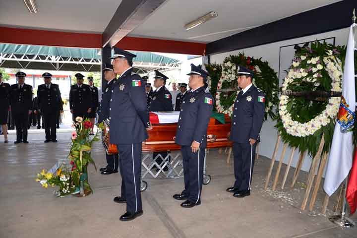 Con un emotivo homenaje realizado en las instalaciones del Instituto Estatal de Formación Policial (EFP), este medio día fue despedido el oficial comandante del agrupamiento de moto-patrullas, Rafael Villegas González, quien falleciera la mañana de ayer cuando recibía atención médica en un nosocomio local.