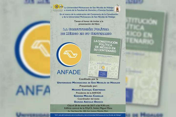 En el marco de las actividades académicas programadas por su Centenario, la Universidad Michoacana de San Nicolás de Hidalgo, a través de su Facultad de Derecho y Ciencias Sociales, presentará este sábado 28 de enero el libro "La Constitución Política de México en su Centenario", obra coordinada por el investigador Germán Molina Carrillo.