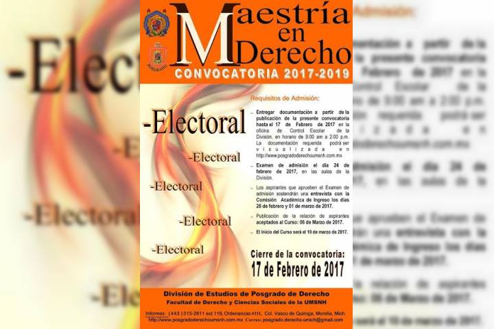 De acuerdo a los objetivos de la Universidad Michoacana de San Nicolás de Hidalgo de brindar una educación pertinente y vinculada a la realidad social del país, la Facultad de Derecho y Ciencias Sociales, a través de su División de Estudios de Posgrado, abre la convocatoria para la Maestría en Derecho Electoral.