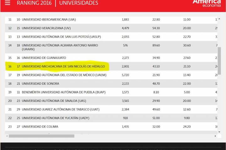 NOTICIAS 24/11/2016Se consolida UMSNH entre las mejores universidades de México Se consolida la Universidad Michoacana de San Nicolás de Hidalgo entre las mejores instituciones de educación superior de México, al ubicarse por su calidad en la posición número 16 en el listado que incluye a universidades de carácter nacional y privadas, de acuerdo con el Ranking América Economía 2016, publicado por el periódico El Economista. La Casa de Hidalgo ascendió una posición con relación al estudio 2015 elaborado por la mis... Ver más...