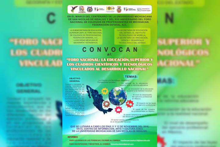 En el marco de la celebración de su Centenario y como parte de las acciones que realiza con el propósito de mantener actualizados los programas educativos orientados a la formación de profesionistas de excelencia, la Universidad Michoacana de San Nicolás de Hidalgo invita a participar en el próximo "Foro Nacional: La Educación Superior y los cuadros científicos y tecnológicos vinculados al desarrollo nacional".