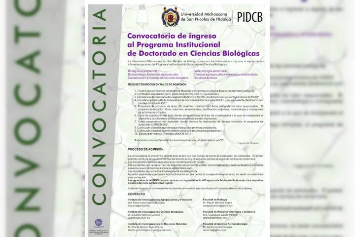 Con posibilidad de recepción de documentos todo el año, el Doctorado en Ciencias Biológicas de la Universidad Michoacana de San Nicolás de Hidalgo se encuentra en su segundo periodo de admisión este mes de noviembre.