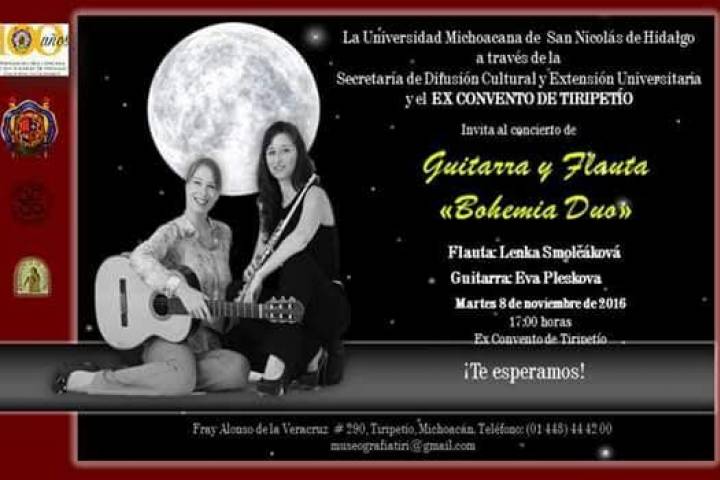 Continuando con las actividades de difusión y promoción de la cultura en el año de su Centenario, la Universidad Michoacana de San Nicolás de Hidalgo, a través de la SecretarÃa de Difusión Cultural y Extensión Universitaria y el Ex convento de TiripetÃo, invitan en esta ocasión al concierto: Guitarra y Flauta "Bohemia dúo".