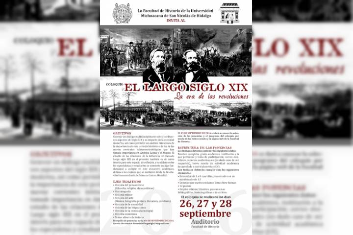 Con el propósito de generar un diálogo multidisciplinario sobre los diversos aspectos del siglo XIX y su impacto en la sociedad moderna, asà como permitir un análisis minucioso de la importancia de este periodo histórico a la luz de las nuevas corrientes que han tomado importancia en América Latina y el mundo, la Facultad de Historia de la Universidad Michoacana de San Nicolás de Hidalgo (UMSNH), invita a los interesados a participar en ... Ver más...
