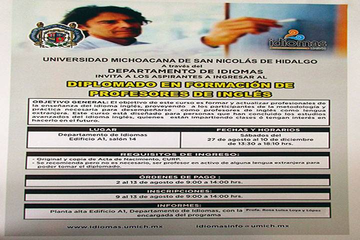 NOTICIAS 02/08/2016UMSNH ofrece Diplomado para Profesores de InglésPara coadyuvar a la actualización curricular de profesores del idioma inglés, y proporcionar a los participantes la metodologÃa y práctica necesaria para desempeñarse como docentes de este idioma como lengua extranjera, la Universidad Michoacana de San Nicolás de Hidalgo, a través de su Departamento de Idiomas, invita a los interesados a ingresar al Diplomado en Formación de Profesores de Inglés, para el periodo de agosto a diciembre 201... Ver más...