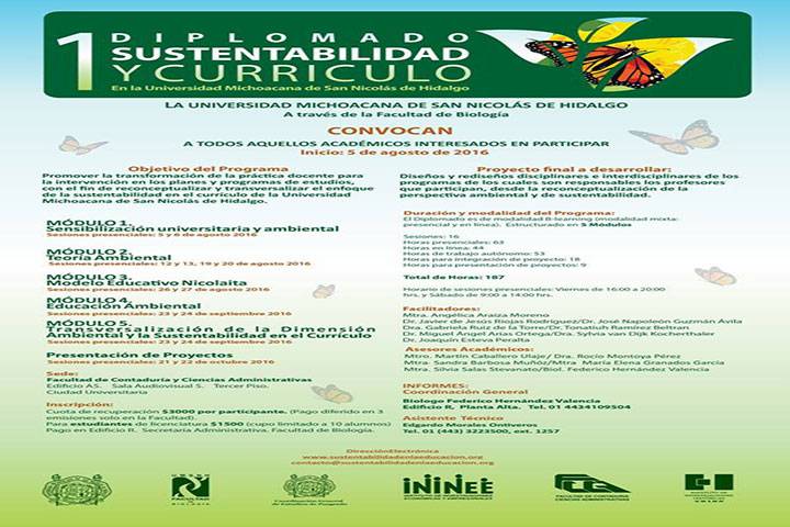 Para promover la transformación de la práctica docente en la intervención en los planes y programas de estudios, con el fin de reconceptualizar y transversalizar el enfoque de la sustentabilidad en los programas de estudio de la Casa de Hidalgo, la Universidad Michoacana de San Nicolás de Hidalgo (UMSNH), convoca a todos aquellos académicos interesados en participar en el "Diplomado Sustentabilidad y CurrÃculum en la UMSNH".