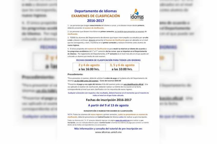 Con la finalidad de que las personas que tengan conocimientos de una lengua diferente al español y tengan el interés de continuar con sus estudios, puedan hacerlo si tomar el curso desde el inicio, el Departamento de Idiomas de la Universidad Michoacana de San Nicolás de Hidalgo (UMSNH), ofrece la posibilidad de presentar un examen de clasificación para ubicarse en el nivel que corresponda.