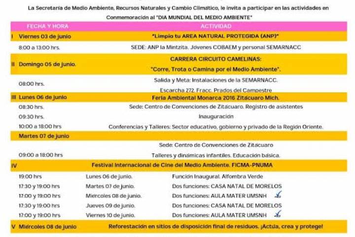 NOTICIAS 01/06/2016UMSNH participa en la 3ª Semana Estatal del Medio AmbienteLa Universidad Michoacana de San Nicolás de Hidalgo, en conjunto con la Secretaría del Medio Ambiente, Recursos Naturales y Cambio Climático (Semarnacc), Procuraduría Federal de Protección al Ambiente (Profepa) y la Secretaría de Innovación y Desarrollo Tecnológico del Estado, llevará a cabo una serie de conferencias, talleres, jornadas de reforestación y actividades deportivas, con motivo del Día Mundial del Medio Ambiente a celebrars... Ver más...