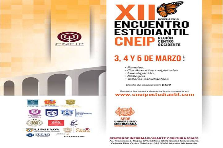 Con la participación de 14 instituciones de educación en Psicología, se llevará a cabo en Escuela Nacional de Estudios Superiores, Unidad Morelia de la Universidad Nacional Autónoma de México el XII Encuentro Estudiantil CNEIP Región Centro-Occidente, a partir del jueves 3 y hasta el sábado 5 del presente; evento del cual su organización estuvo a cargo de la Universidad Michoacana de San Nicolás de Hidalgo, a través de la Facultad de... Ver más...