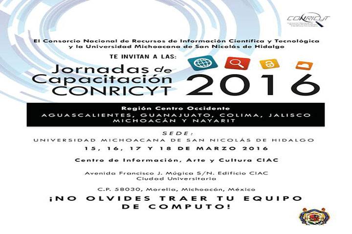 Con el objetivo de integrar la información científica y tecnológica a la bibliografía de los Planes de Asignatura, que forman parte de los programas de posgrado y de las diferentes carreras a nivel licenciatura, así como temas de tesis y seminarios, la Universidad Michoacana de San Nicolás de Hidalgo (UMSNH), será sede durante el mes de marzo de las Jornadas de Capacitación CONRICYT 2016, de la Región Centro Occidente conformada por lo... Ver más...