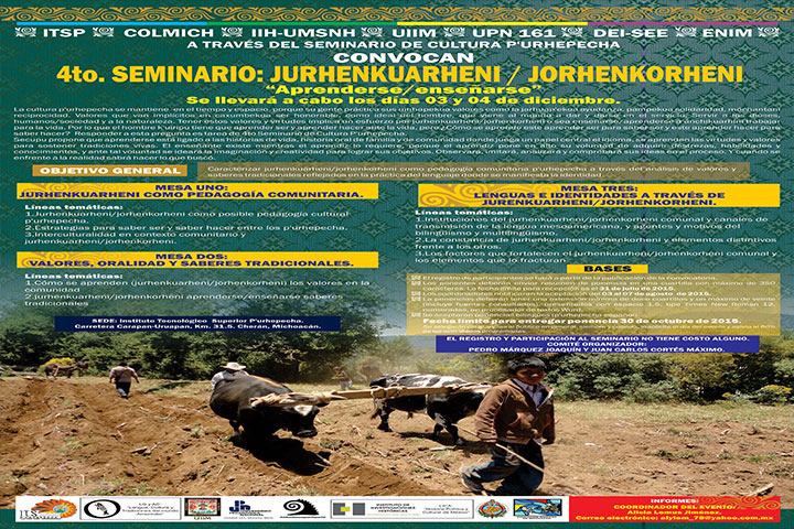 Con el propósito de mantener viva en tiempo y espacio nuestra cultura representada mayormente por la etnia Purhépecha, el Instituto Tecnológico Superior Purhépecha con el apoyo del Instituto de Investigaciones Históricas de la Universidad Michoacana de San Nicolás de Hidalgo (UMSNH), llevarán a cabo los días 3 y 4 de diciembre el Cuarto Seminario Jurhenkuarheni/Jorhenkorheni "Aprenderse/enseñarse".