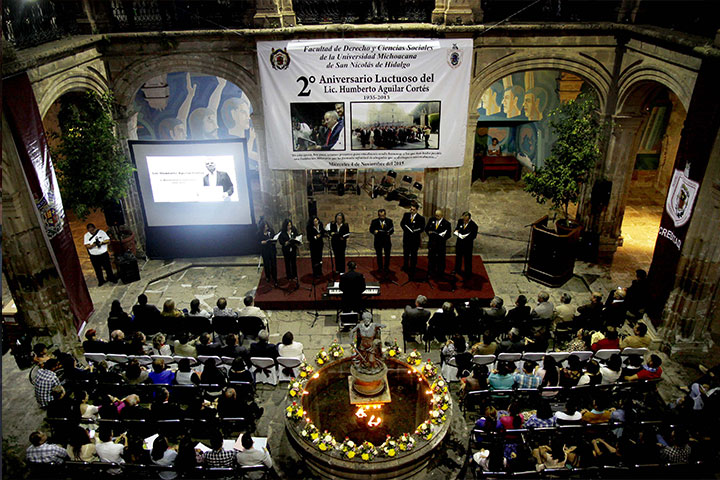 A dos años de su fallecimiento, el impulso vital de Humberto Aguilar Cortés sigue dando cátedra, afirmó el docente distinguido de la Facultad de Derecho y Ciencias Sociales, Jorge Orozco Flores, orador oficial del homenaje póstumo que la Casa de Hidalgo rindió a quien fuera el decano de la Facultad y tres veces director.