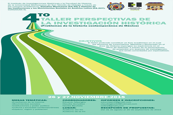 NOTICIAS 09/09/2015Imparte UMSNH taller sobre investigación en HistoriaLa exposición del conocimiento y el acompañamiento a los jóvenes investigadores forma parte del quehacer de los cuerpos académicos de investigadores, de allí que la Universidad Michoacana de San Nicolás de Hidalgo, a través del Instituto de Investigaciones Históricas y la Facultad de Historia, realizará el evento de tutoría en la investigación denominado: "4to Taller perspectivas de la Investigación Histórica", centrado en los proble... Ver más...