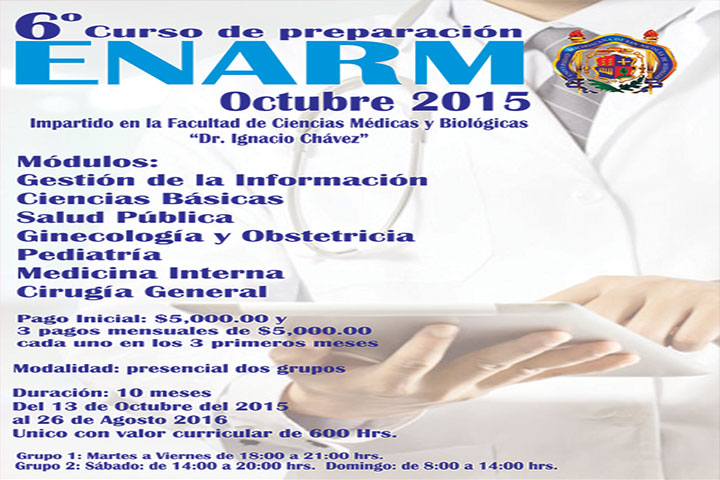 NOTICIAS 02/09/2015UMSNH ofrece curso preparatorio para el ENARM 2015Para brindar una preparación profesional a los médicos interesados en presentar el Examen Nacional de Aspirantes a Residencias Médicas (ENARM) del próximo año y aumentar la probabilidad de que sean seleccionados, la Facultad de Ciencias Médicas y Biológicas "Dr. Ignacio Chávez", de la Universidad Michoacana de San Nicolás de Hidalgo (UMSNH), convoca a los interesados a inscribirse al Sexto Curso de Preparación ENARM 2015.