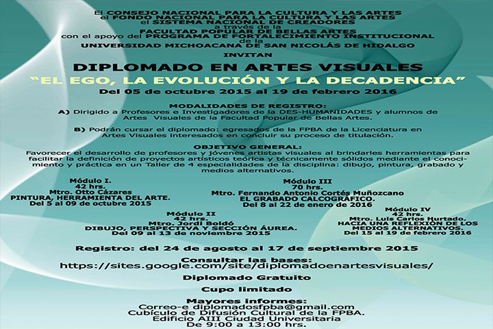 NOTICIAS 31/08/2015Abre UMSNH Diplomado de Artes Visuales para comunidad de la FPBAEn busca de favorecer el desarrollo de profesores y jóvenes artistas visuales al brindarles herramientas para facilitar la definición de proyectos artísticos teórica y técnicamente sólidos mediante el conocimiento y práctica, la Universidad Michoacana de San Nicolás de Hidalgo, como parte del Programa de Fortalecimiento Institucional, abrió un diplomado en Artes Visuales dirigido a profesores de la DES de Humanidades y alumnos de la Lice... Ver más...