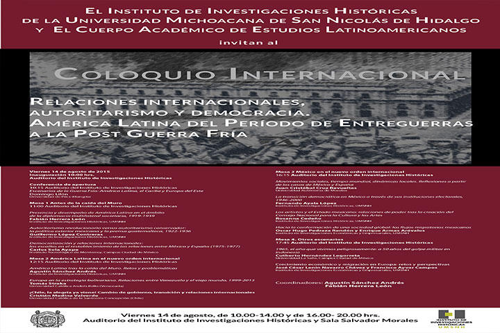 El Instituto de Investigaciones Históricas (IIH), de la Universidad Michoacana de San Nicolás de Hidalgo y el Cuerpo Académico de Estudios Latinoamericanos, inicia este viernes el Coloquio Internacional "Relaciones Internacionales, autoritarismo y democracia. América Latina del periodo de entreguerras a la post guerra fría".