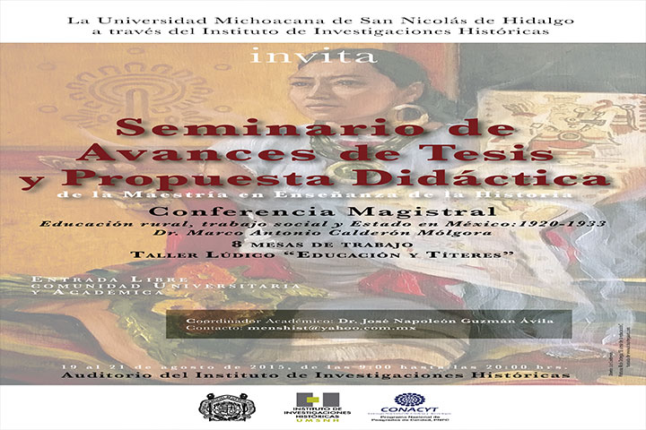 La Universidad Michoacana de San Nicolás de Hidalgo, a través del Instituto de Investigaciones Históricas (IIH), invita a la comunidad universitaria y académica, al Seminario de Avances de Tesis y Propuestas Didácticas de la Maestría en Enseñanza de la Historia.