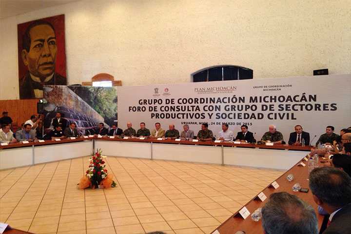 NOTICIAS 24/03/2015Inicia Foro Ciudadano en Uruapan La Facultad de Agrobiología "Presidente Juárez" de la Universidad Michoacana de San Nicolás de Hidalgo, en Uruapan, es sede del Foro de Consulta con Grupo de Sectores Productivos y Sociedad Civil, encabezada por el gobernador del Estado, Salvador Jara Guerrero, y por el general Pedro Felipe Gurrola Ramírez, coordinador de la Estrategia de Seguridad del Plan Michoacán.