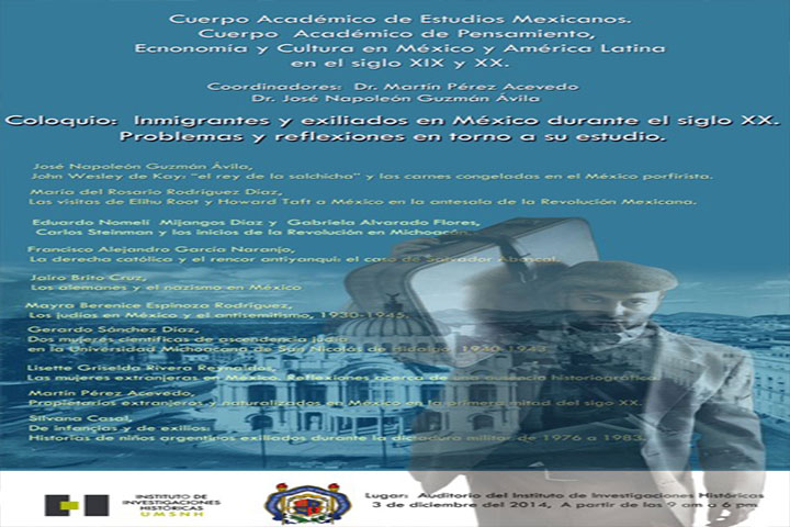 NOTICIAS 02/12/2014El miércoles inicia Coloquio Inmigrantes y Exiliados en México durante el siglo XXCon el objetivo de dar a conocer la problemática y reflexionar acerca de la presencia extranjera en el México de finales del siglo XIX y principios del siglo XX, el dÃa de mañana miércoles 3 de diciembre, a partir de las nueve horas, tendrá lugar en el Auditorio del Instituto de Investigaciones Históricas, de la Universidad Michoacana de San Nicolás de Hidalgo (UMSNH), el Coloquio: Inmigrantes y Exiliados en México durante el siglo XX. P... Ver más...