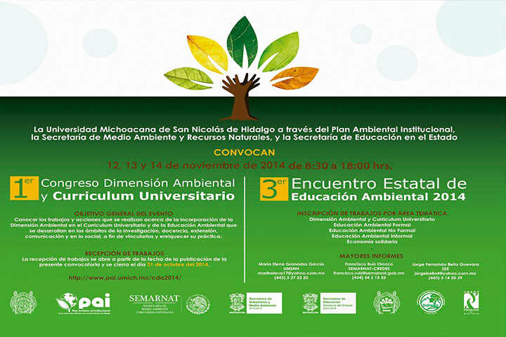 NOTICIAS 10/11/2014Miércoles inicia en el Hotel Punta Galería Congreso Ambiental del PAILa Universidad Michoacana de San Nicolás de Hidalgo a través del Plan Ambiental Institucional, la Secretaría de Medio Ambiente y Recursos Naturales y la Secretaría de Educación en el Estado; llevarán a cabo el "1er CONGRESO DIMENSIÓN AMBIENTAL Y CURRICULUM UNIVERSITARIO" y "3er ENCUENTRO ESTATAL DE EDUCACIÓN AMBIENTAL 2014", "Educación ambiental para la sustentabilidad: retos y oportunidades". De igual forma se estará llevando a cabo el... Ver más...
