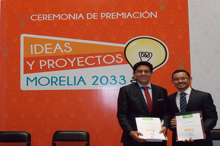 NOTICIAS 27/07/2014Nicolaitas reciben Premio "Ideas y Proyectos Morelia 2033"Los nicolaitas de la Facultad de Ingeniería Civil Omar Lucas Urbina y Juan Antonio Torres, fueron reconocidos por el Ayuntamiento de Morelia a través del Consejo Ciudadano con el Premio "Ideas y Proyectos Morelia 2033".