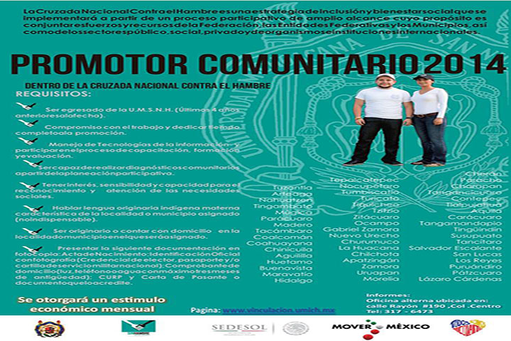 La Universidad Michoacana de San Nicolás de Hidalgo (UMSNH), a través del convenio general y específico de colaboración signado con la Secretaría de Desarrollo Social (SEDESOL), convocan a los egresados de las distintas facultades para que se sumen como promotores comunitarios en la Cruzada Nacional contra el Hambre, con el fin de multiplicar y potenciar los resultados en beneficio de la población objetivo.