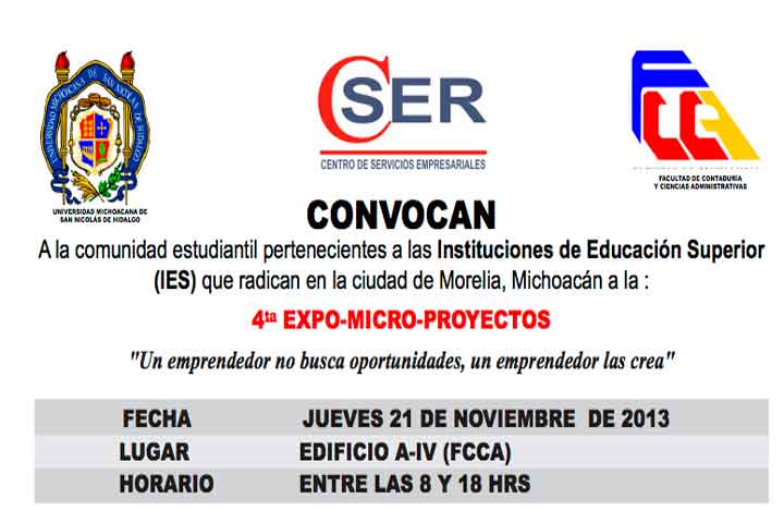 Para incentivar la creatividad de los estudiantes para desarrollar una actitud emprendedora y al tiempo dar a conocer los proyectos de los jóvenes emprendedores michoacanos mediante la exposición de sus productos y servicios, la Facultad de ContadurÃa y Ciencias Administrativas de l Universidad Michoacana de San Nicolás de Hidalgo invita a la comunidad estudiantil de las instituciones de educación superior de Morelia a la 4ta Expo - Micro... Ver más...