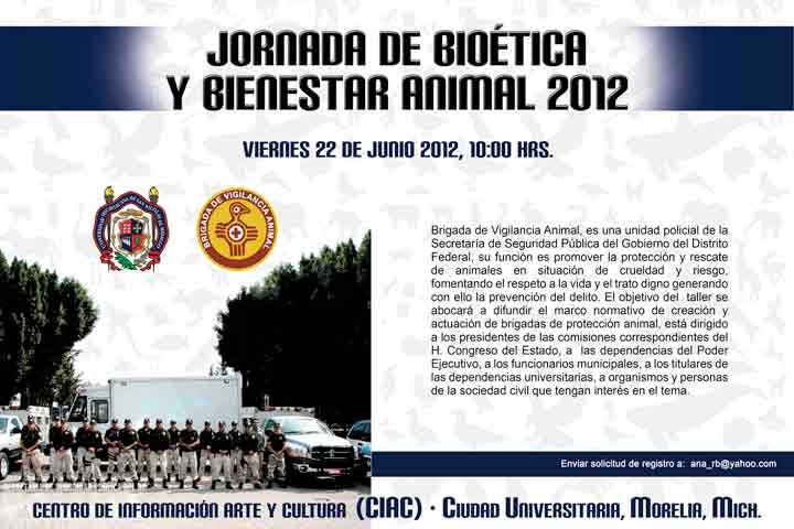 NOTICIAS 15/06/2012UMSNH llevará acabo taller Brigada de Vigilancia Animal Con la finalidad de dar continuidad al trabajo que se desarrolla como parte de las Jornadas de bioética y bienestar animal, encaminadas a impulsar a través de diversas actividades académicas la salud en este ámbito, se llevará a cabo el taller Brigada de Vigilancia Animal el 22 de junio a las 10:00 horas en el Centro de Información Arte y Cultura (CIAC), de Ciudad Universitaria.