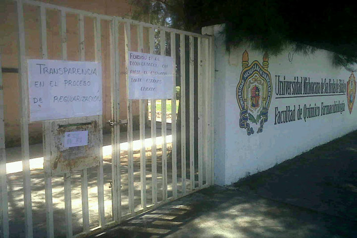 NOTICIAS 25/04/2012Acuerdan sancionar a profesores que mantiene toma en la Facultad de Químico FramacobiologíaDespués de la reunión que sostuvo el rector de la Máxima Casa de Estudios de la Universidad Michoacana, Salvador Jara Guerrero, con representantes integrantes del Consejo Técnico de la Facultad de Farmacobiología, se acordó sancionar a los profesores que mantienen tomadas las instalaciones de la facultad desde el pasado 19 de abril.